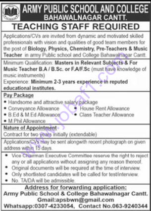 Here is how you can apply for a job at Army Public School & College APS&C Bahawalnagar Cantt: