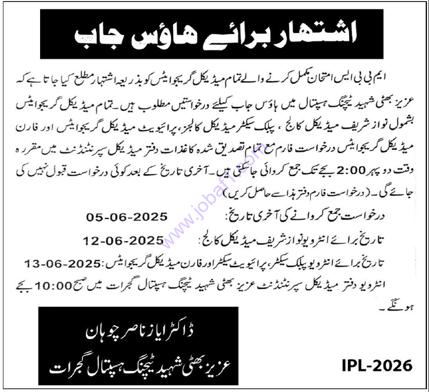 Category / Sector: Government Organization: Aziz Bhatti Shaheed Teaching Hospital Location: Bhimber Road, Gujrat, Punjab, Pakistan Job Type: Full Time Job Area: Medical Jobs Date Posted: 23 May, 2025 Last Date to Apply: 05 June, 2025 (or the date in the newspaper ad)