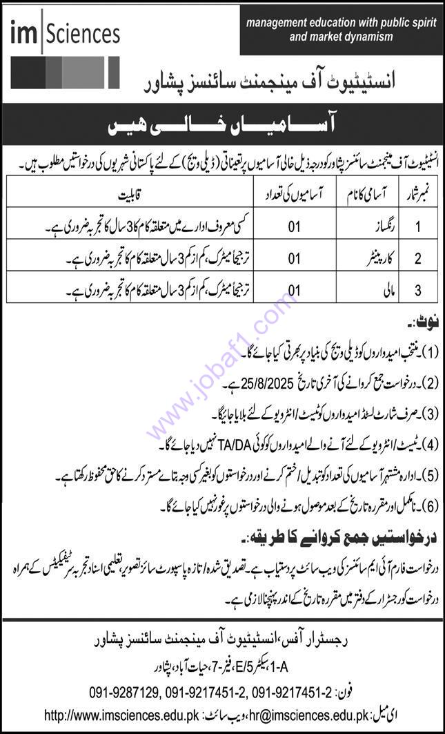 The Institute of Management Sciences (IMSciences) has announced new government job opportunities in Peshawar. These full-time positions in human resources are open to candidates with Middle or Matric education. Located in Hayatabad Phase 7, IMSciences Jobs 2025 provide a great opportunity for career growth in a professional and respected government organization.