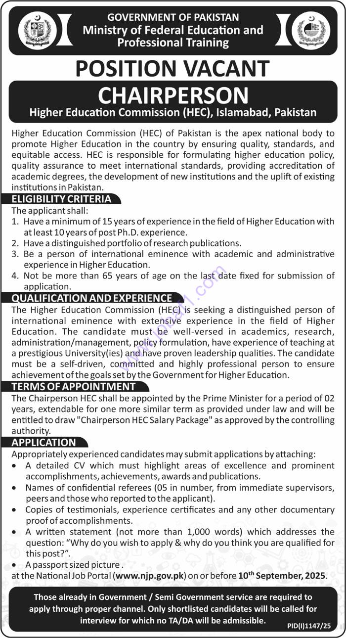 MOENT is a federal government body responsible for overseeing educational policies, training programs, and skill development initiatives across Pakistan. Working here provides an opportunity to contribute to national development while gaining experience in policy implementation, program management, and strategic planning.