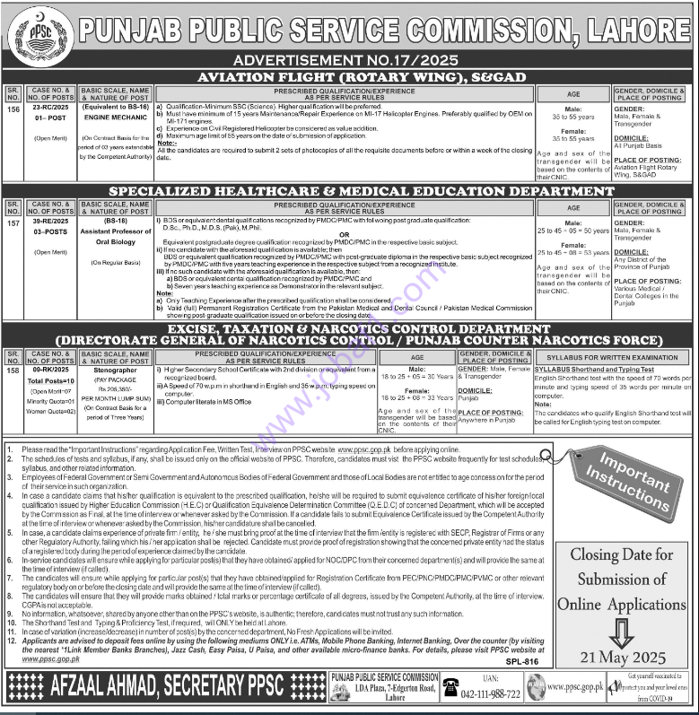 Organization: Punjab Public Service Commission (PPSC) Job Sector: Government Job Type: Full Time Location: Egerton Road, Lahore, Punjab, Pakistan Date Posted: 06 May, 2025 Last Date to Apply: 21 May, 2025 (or as told in the newspaper ad) Job Area: Management Jobs