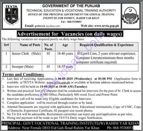 Login to Send MessageAre you looking for a new job? The Technical Education & Vocational Training Authority (TEVTA) is hiring people for various jobs in Rahim Yar Khan, Punjab. If you are interested in government jobs 2025 or want to apply for new govt jobs, this is a great opportunity for you. Read on to learn more about the available jobs and how you can apply!