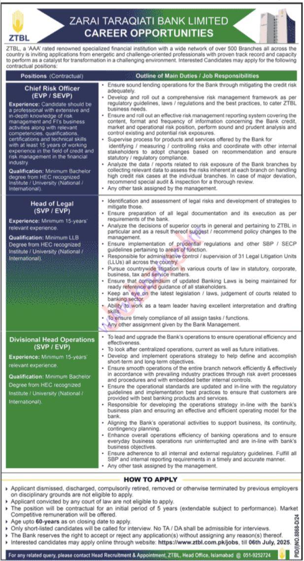 ZTBL is a well-known government-owned bank in Pakistan that provides agricultural and rural development financing. These full-time roles are available at the bank’s Islamabad branch, offering career growth and stability in the public sector.